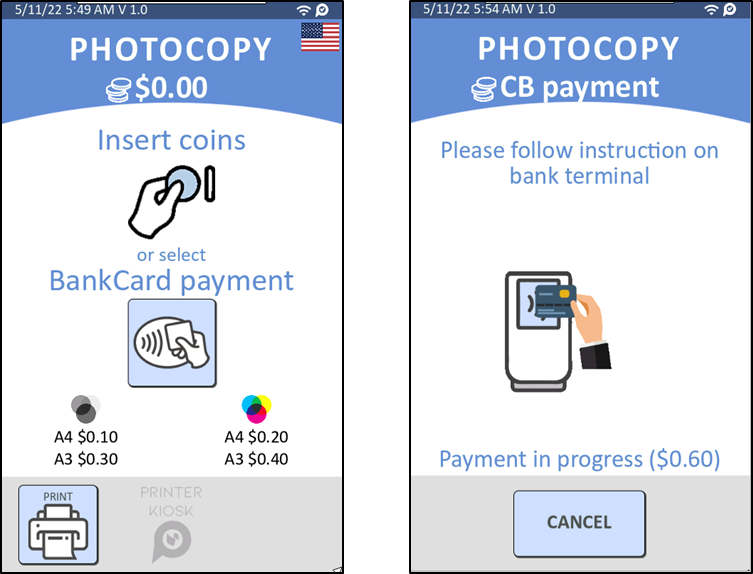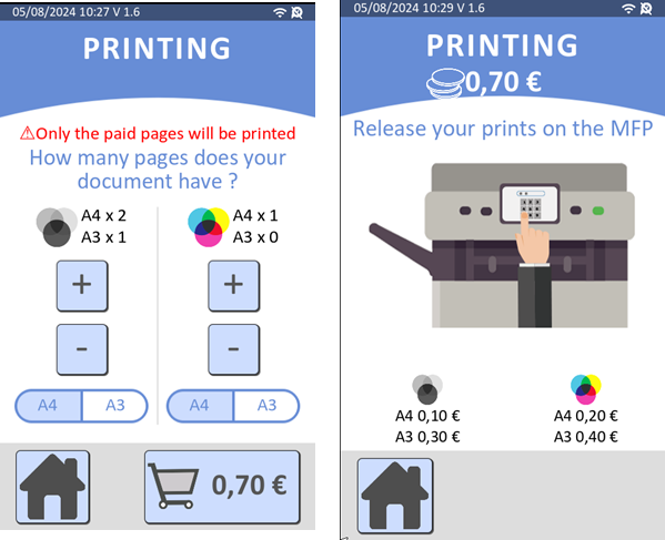 - Une fois validé, l'utilisateur présente sa carte bancaire pour payer son crédit de photocopie qui s'affiche à l'écran.