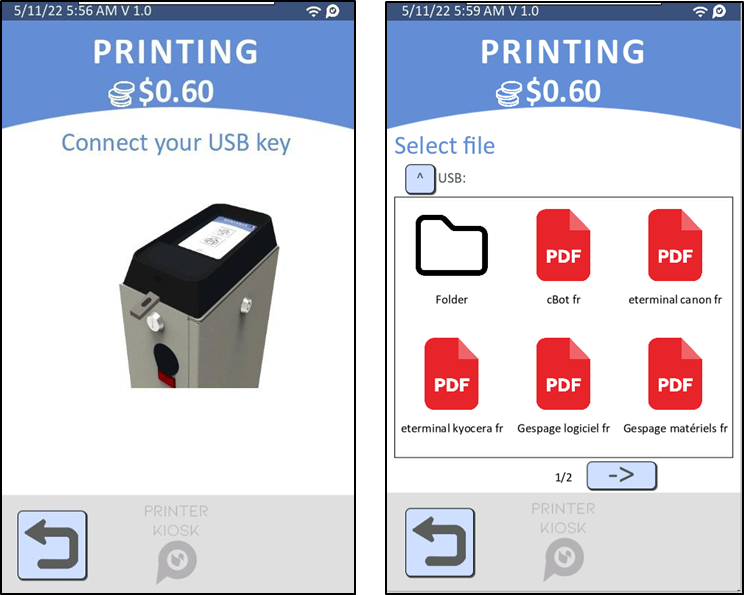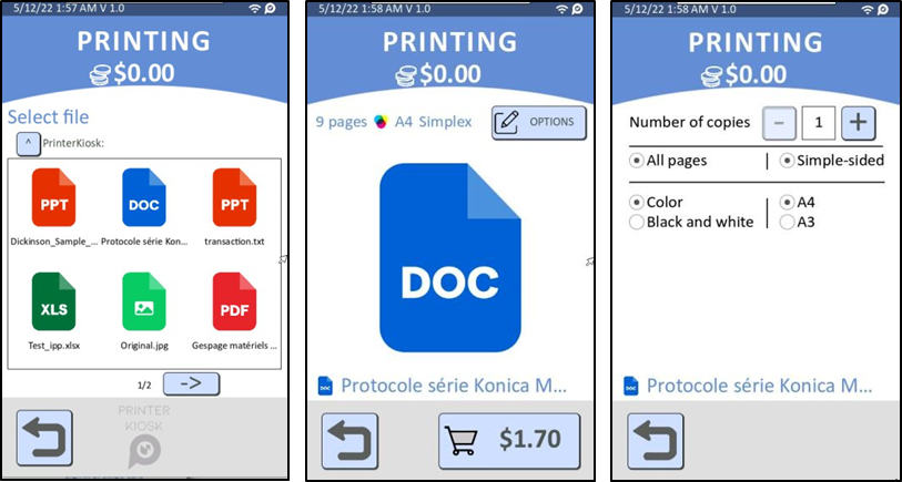 o Ajout de l'affichage des formats de documents acceptés sur l'écran de sélection de la source d'impression pour les modes USB et PrinterKiosk afin d'aider les utilisateurs à identifier les types de fichiers compatibles.