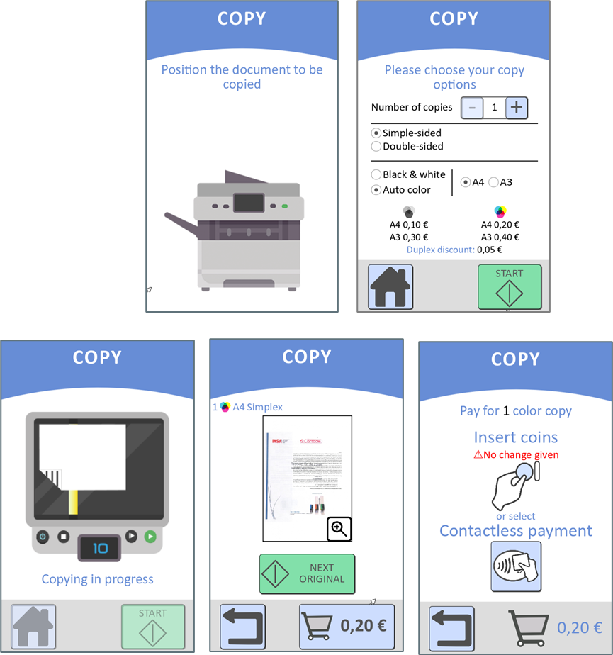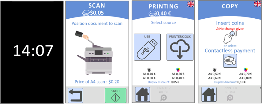 Sur la machine, il saisit son code d'impression et est invité à sélectionner les informations relatives à la tâche à effectuer (format, noir et blanc ou couleur, nombre de copies), puis il peut payer en espèces ou par carte de crédit.