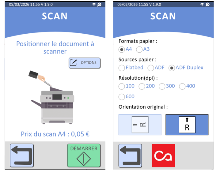 o Ajout d'options de numérisation accessibles à l'utilisateur, notamment la qualité (DPI), l'orientation, la source (ADF/plateau) et le format du papier, via un nouveau bouton de configuration dans le flux de travail de numérisation.